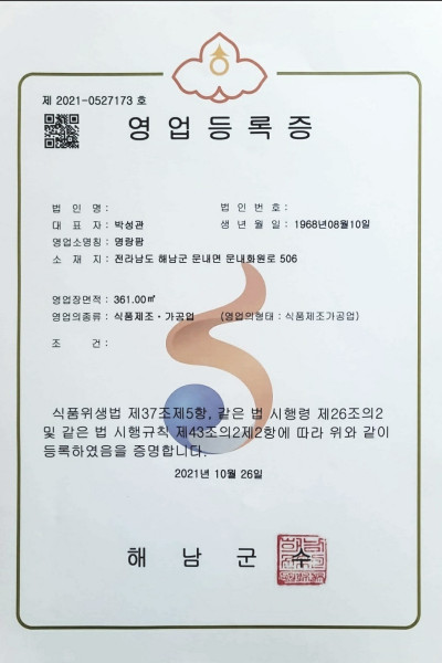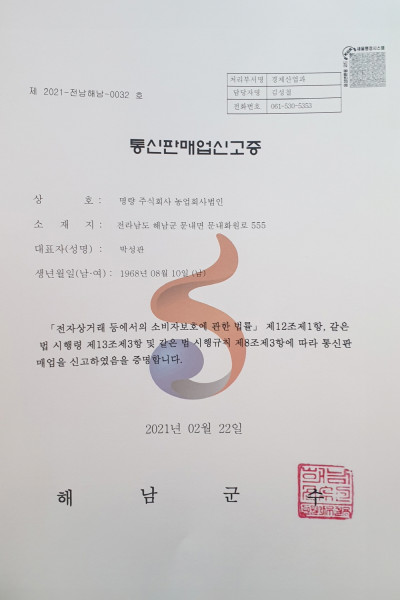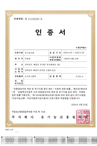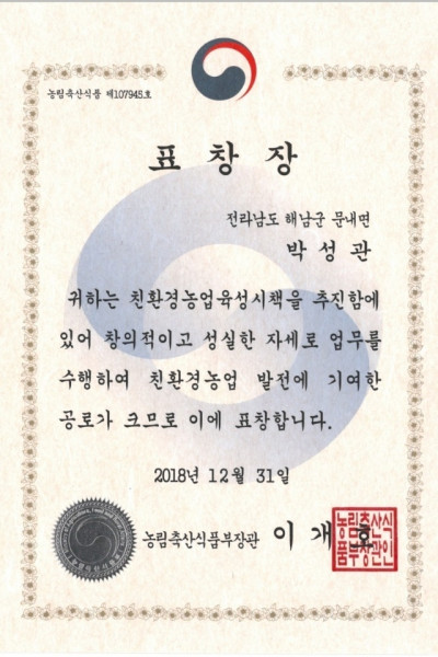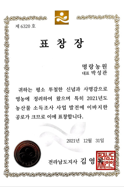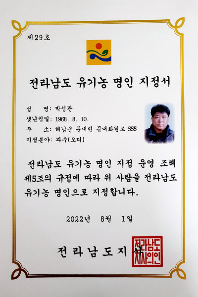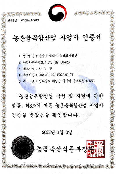 농원소개 인사말 농원소개 명랑 HISTORY 수상이력 언론보도 오시는길 명랑 blog 수상이력 Total 11건 1 페이지 게시판 검색 11 2024 유기농업기능사 국가기술 자격증 작성자 최고관리자 작성일 02-06 조회 19 10 유기농 농산물 인증서(오디 외 2품목) 작성자 최고관리자 작성일 12-09 조회 45 9 무농약 농산물 인증서 (건고추 외 7품목) 작성자 최고관리자 작성일 12-09 조회 24 8 전라남도지사 통합상표 사용허가서 작성자 최고관리자 작성일 12-04 조회 54 7 2023 농촌융복합산업 사업자 인증서 작성자 최고관리자 작성일 12-04 조회 33 6 2022 전라남도 유기농 명인 지정서 작성자 최고관리자 작성일 12-04 조회 22 5 2021 해남군 농업인 대상(원예특작) 작성자 최고관리자 작성일 12-04 조회 23 4 2021 통신판매업신고증 작성자 최고관리자 작성일 12-04 조회 13 3 2021 전라남도지사 표창장 작성자 최고관리자 작성일 12-04 조회 11 2 2021 영업등록증 작성자 최고관리자 작성일 12-04 조회 34 1 2018 농림축산식품부장관 표창장 작성자 최고관리자 작성일 12-04 조회 24