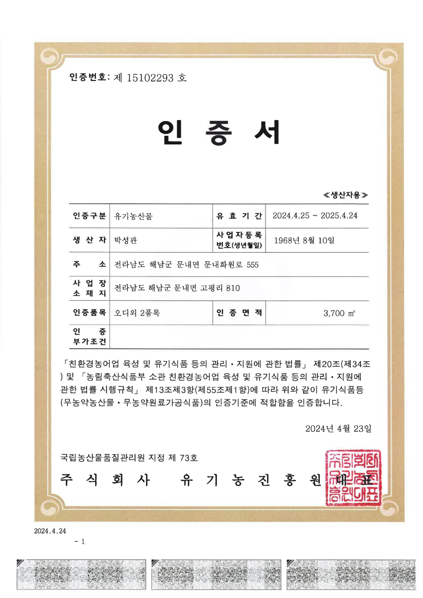 유기농 농산물 인증서(오디 외 2품목) 페이지 정보 작성자 최고관리자 댓글 0건 조회 45회 작성일 24-12-09 20:02 목록 본문 유기농 농산물 인증서(뽕나무, 뽕잎, 오디) 이전글2024 유기농업기능사 국가기술 자격증 25.02.06 다음글무농약 농산물 인증서 (건고추 외 7품목) 24.12.09 댓글 0 댓글목록 등록된 댓글이 없습니다.