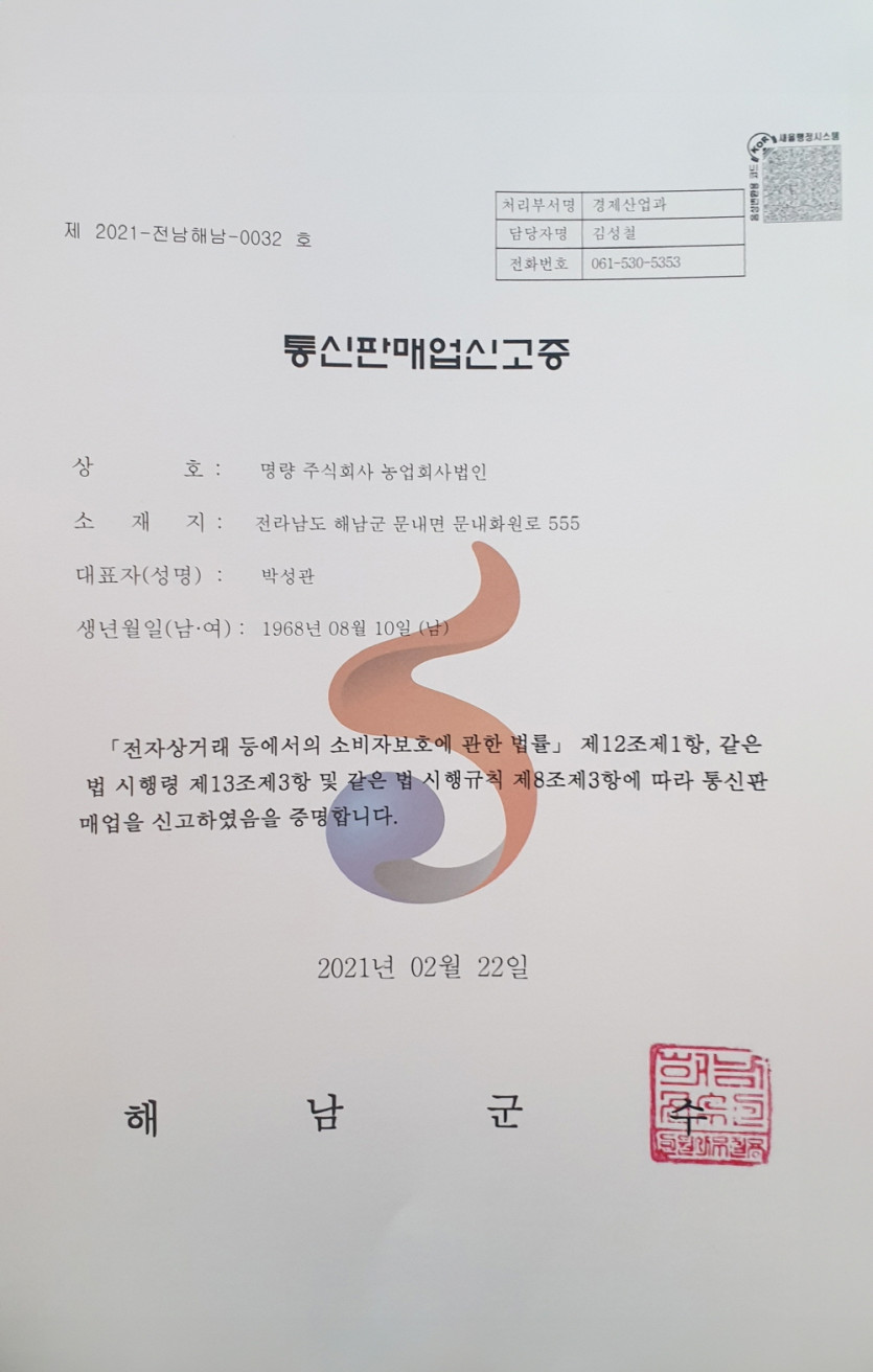 2021 통신판매업신고증 페이지 정보 작성자 최고관리자 댓글 0건 조회 13회 작성일 24-12-04 11:31 목록 본문 2021 통신판매업신고증 이전글2021 해남군 농업인 대상(원예특작) 24.12.04 다음글2021 전라남도지사 표창장 24.12.04 댓글 0 댓글목록 등록된 댓글이 없습니다.