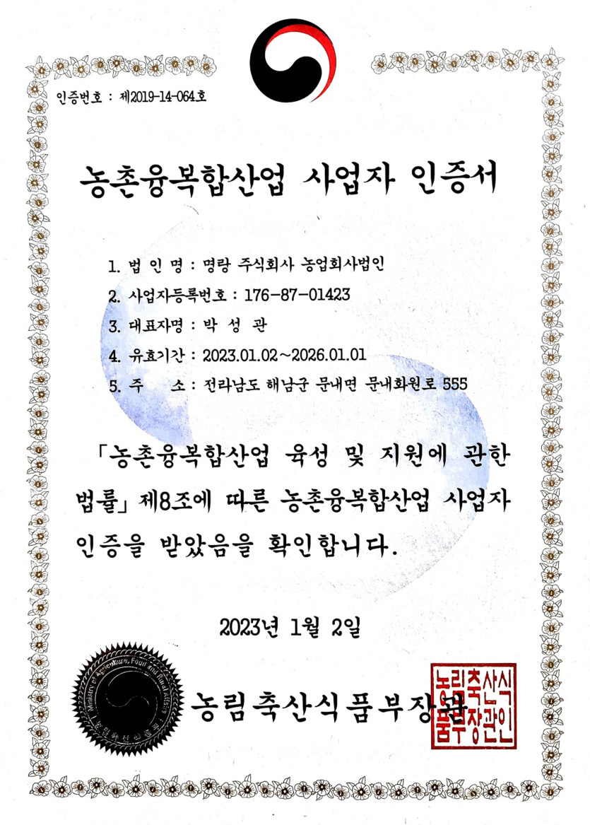 2023 농촌융복합산업 사업자 인증서 페이지 정보 작성자 최고관리자 댓글 0건 조회 33회 작성일 24-12-04 11:32 목록 본문 2023 농촌융복합산업 사업자 인증서 이전글전라남도지사 통합상표 사용허가서 24.12.04 다음글2022 전라남도 유기농 명인 지정서 24.12.04 댓글 0 댓글목록 등록된 댓글이 없습니다.